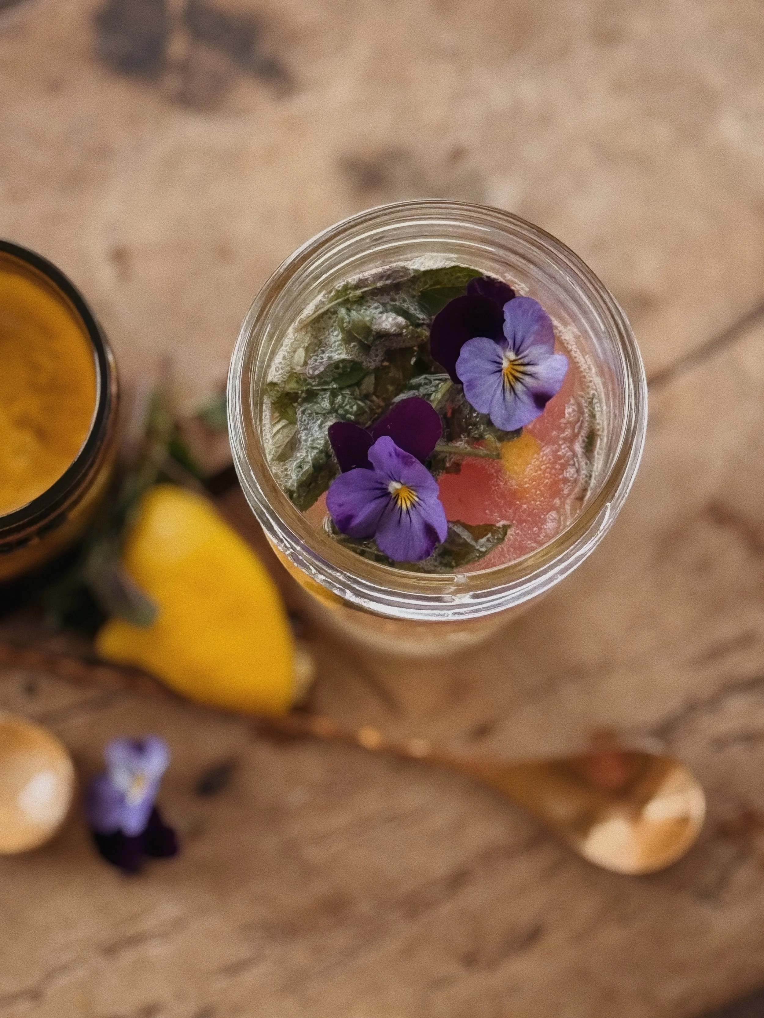 Bright from the lemon, slightly sharp from the apple cider vinegar, softened with honey, and finished with beautiful edible flowers.